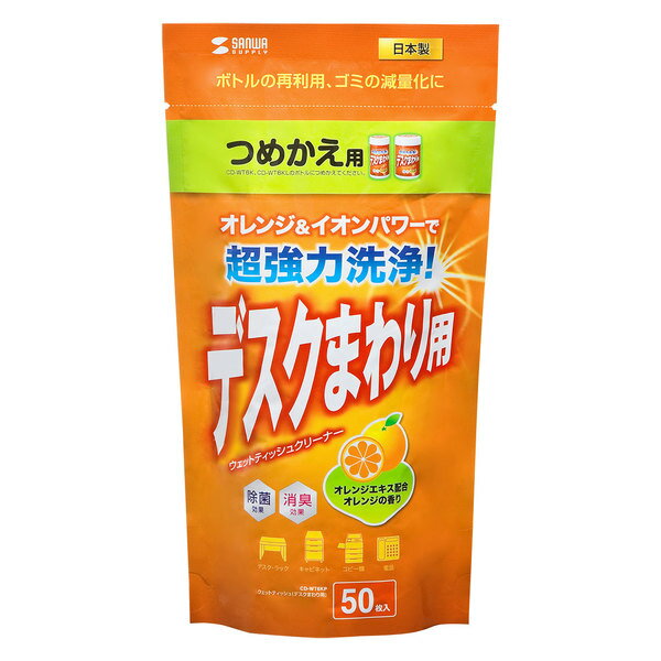 【商品詳細】トリプル効果でしつこい汚れも強力に落とす。●CD-WT6K/WT6KLの詰め替え用(50枚)です。●ボトルの再利用、ゴミの減量化に役立ちます。●オレンジエキス(リモネン)とマイナスイオンを含んだ電解アルカリイオン水の働きと、超極細繊維の力で頑固な汚れもしっかり落とします。●拭き取り性能の高いアクリル系超極細繊維の不織布を使用しています。この特殊構造により強力な拭き取り性能を発揮します。